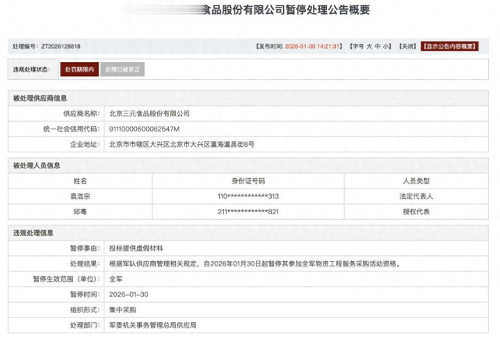 日前,军队采购网显示,知名乳企三元股份因“投标提供虚假材料”而被处以暂停参加全军物资工程服务采购活动资格。根据军队供应商管理相关规定,自2026年1月30日起暂停三元股份参加全军物资工程服务采购活动资格。